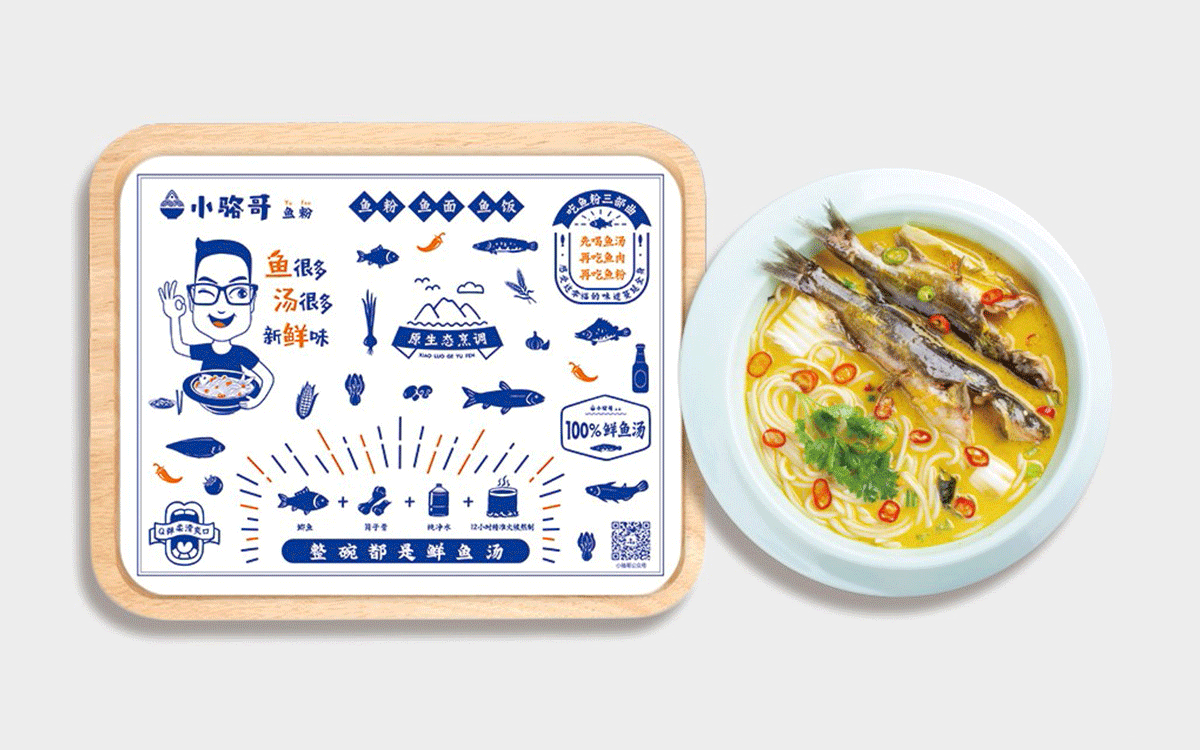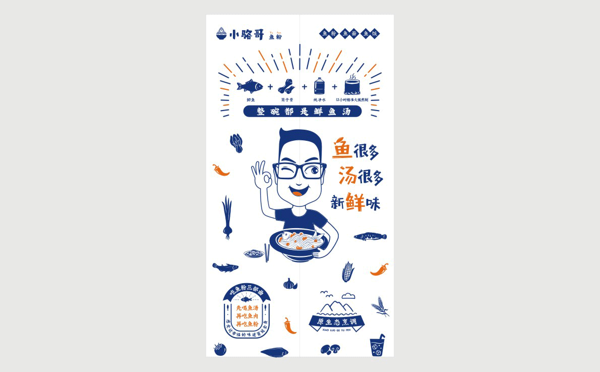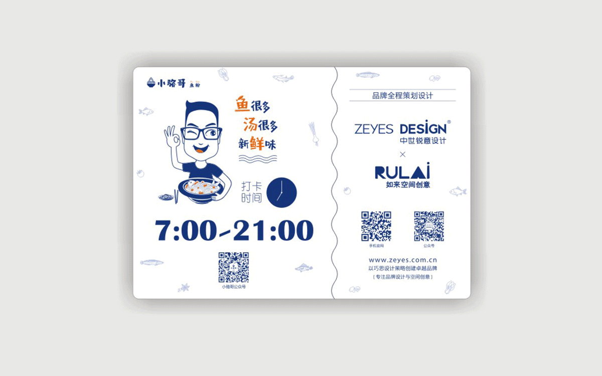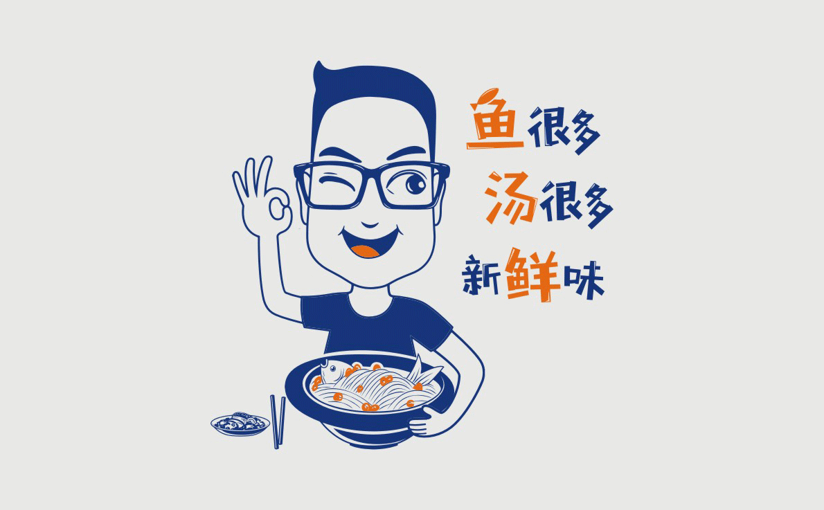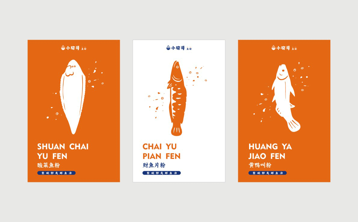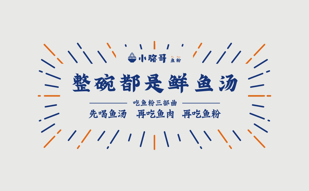 這是2018年中世銳意設(shè)計(jì)接受委托的一個小型輕食餐飲項(xiàng)目,委托人已經(jīng)在當(dāng)?shù)爻晒\(yùn)營了另一個知名度頗高的簡餐品牌——“挑香小面”,這一次重新建立全新品牌,是想拓展餐飲管理公司的產(chǎn)品范圍,并建立更加時尚的輕食品牌。小駱哥魚粉從命名開始,就自帶了濃濃的人情味,用小駱哥本人的昵稱作為品牌名,也展現(xiàn)了委托人對自己產(chǎn)品的自信。人情味與自信結(jié)合、美味與趣味融合,是我們對這個品牌最基本的創(chuàng)作思路。中世銳意設(shè)計(jì)以小駱哥本人為基本原型創(chuàng)作了系列卡通人物插畫;我們創(chuàng)作了系列關(guān)注年輕人學(xué)習(xí)、生活中內(nèi)心波瀾的小段子;我們在空間設(shè)計(jì)中嵌入魚元素的造型,讓小魚空間中游弋,使其成為品牌的超級符號;我們用原生態(tài)實(shí)木設(shè)計(jì)的戶外招牌,展現(xiàn)了濃濃的人情味; 獲得第13屆“創(chuàng)意中國”設(shè)計(jì)大獎賽全國金獎。